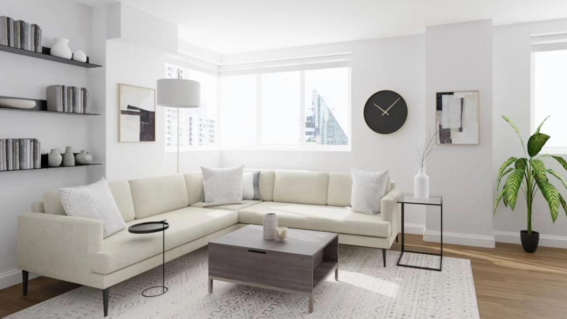 * **Ruang Tamu:** Sofa ramping, karpet tipis, meja kopi kecil, dan tanaman hijau menciptakan ruang tamu minimalis yang nyaman dan natural.